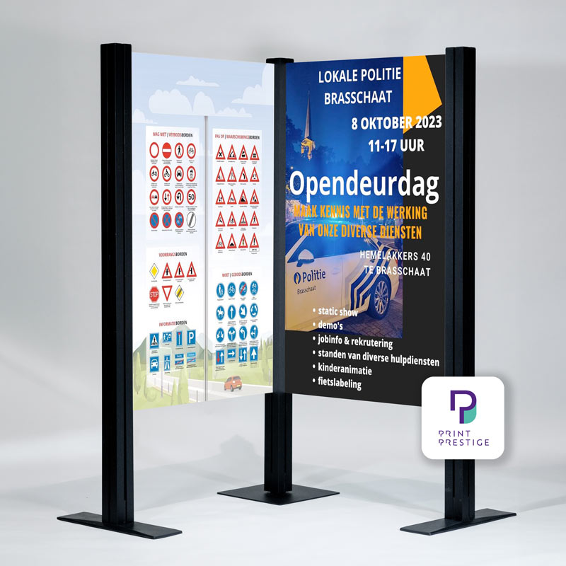 De borden in de vrijstaande wanden vervaardigen we uit 10mm PVC-platen of honingraatkarton (Reboard), beide materialen zijn bekend om hun stevigheid en duurzaamheid. Je kan kiezen voor enkelzijdige of dubbelzijdige bedrukking van de wand panelen, zodat jouw boodschap altijd goed zichtbaar is.